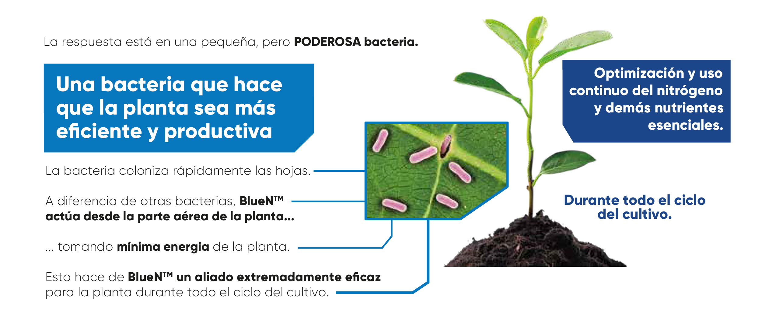 BlueN™ es un Bioestimulante a base una bacteria única y patentada capaz de optimizar el nitrógeno y nutrientes esenciales en las plantas, potenciando la eficiencia en los cultivos. Cultivos más eficientes en el uso del Nitrógeno y nutrientes necesarios, activando el poder de la naturaleza a tu favor.